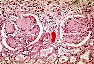 Two glomeruli in diabetic kidney disease: the acellular light purple areas within the capillary tufts are the destructive mesangial matrix deposits. | |