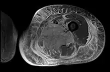 - ↑ Bhasin R, Ghobrial I (2013). "Diabetic myonecrosis: a diagnostic challenge in patients with long-standing diabetes". Journal of Community Hospital Internal Medicine Perspectives. 3 (1): 20494. doi:10.3402/jchimp.v3i1.20494. PMC 3716030. PMID 23882392.
