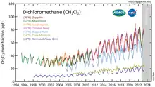 CH2Cl2 measured by the Advanced Global Atmospheric Gases Experiment (AGAGE) in the lower atmosphere (troposphere) at stations around the world. Abundances are given as pollution free monthly mean mole fractions in parts-per-trillion.