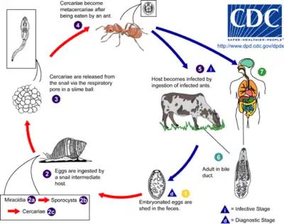 - 1 2 3 "Dicrocoeliasis [Dicrocoelium dendriticum]". DPDx - Laboratory Identification of Parasites of Public Health Concern. Centers for Disease Control and Prevention. 28 December 2017. Archived from the original on 14 January 2019. Retrieved 13 January 2019.