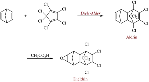 Dieldrin can be formed from the Diels-Alder reaction of hexachloro-1,3-cyclopentadiene with norbornadiene followed by epoxidation of the addition product with a peroxy acid such as peracetic acid.[6]