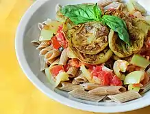 Penne with eggplant and basil in yogurt-tomato sauce. Dish is a part of cookbook for women with Gestational diabetes.