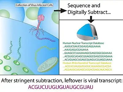Digital transcriptome subtraction (DTS) is a bioinformatics method to detect the presence of novel pathogen transcripts through computational removal of the host sequences. DTS is the direct in silico analogue of the wet-lab approach representational difference analysis (RDA), and is made possible by unbiased high-throughput sequencing and the availability of a high-quality, annotated reference genome of the host. The method specifically examines the etiological agent of infectious diseases and is best known for discovering Merkel cell polyomavirus, the suspect causative agent in Merkel-cell carcinoma.[1]