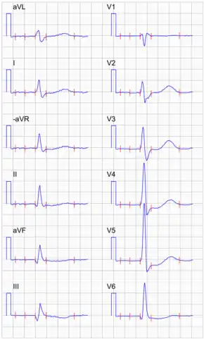Signal-averaged ECG from a person taking digoxin, explaining ST depressions in mainly precordial leads V4 and V5.