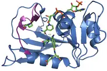 - 1 2 3 Sawaya MR, Kraut J (January 1997). "Loop and subdomain movements in the mechanism of Escherichia coli dihydrofolate reductase: crystallographic evidence". Biochemistry. 36 (3): 586–603. doi:10.1021/bi962337c. PMID 9012674.