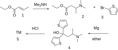 The conjugate addition between Ethyl crotonate [623-70-1][10544-63-5] (1) and dimethylamine gives Ethyl 3-(Dimethylamino)Butanoate [85118-28-1] (2). Grignard reaction with 2-Bromothiophene [1003-09-4] (3) gives (4). Dehydration in acid completed the synthesis (5).