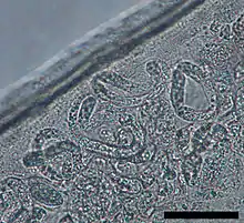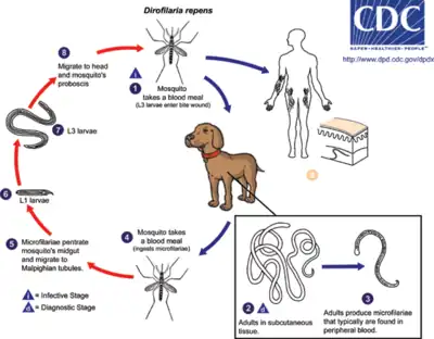 The lifecycle of D. repens consists of five larval stages in a vertebral host and an arthropod (mosquito) intermediate host and vector. In the first stage, mated adult female worms produce thousands of microfilariae (larvae) into the circulation daily, which are ingested by mosquitoes in a blood meal. Larvae develop into infective larvae within the mosquito over the next 10–16 days, depending on environmental conditions, before being reintroduced back into a new host.[1] Microfilariae undergo secondary developmental changes in the insect. For the final two stages of development, third-stage larvae are inoculated back into a vertebral host during an act of feeding. The adults of D. repens reside in the subcutaneous tissues of dogs and cats, where they mature in 6–7 months. Adult worms are 1–2 mm in diameter (females are 25–30 cm in length, the males being shorter).