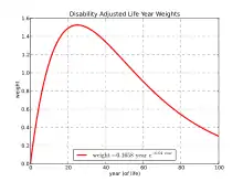 The Global Burden of Disease Study (GBD) 2001–2002 counted disability adjusted life years equally for all ages, but the GBD 1990 and GBD 2004 studies used the formula[15]