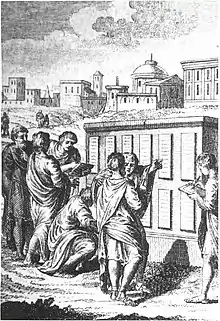 The Twelve Tables included a law that said disabled children should be put to death, usually by stoning. They also stipulated that if a free person or an enslaved person is injured by another individual and becomes disabled, the injurer has to pay a certain amount of money or is punished by being impaired in a similar fashion.[5]