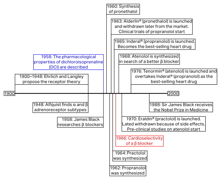 The β-blockers are an immensely important class of drugs due to their high prevalence of use. The discovery of β-blockers reaches back to more than 100 years ago, when early investigators came up with the idea that catecholamines were binding selectively to receptor-like structures and that this was the cause of their pharmacological actions.[3] In 1948, Raymond P. Ahlquist published a seminal paper concluding his findings, that there were two distinct receptors for catecholamine drugs, and they caused different responses in the heart muscle. He labeled them α-and β-adrenoceptors. These findings were soon to be a foundation for further research into drug development.[4]
