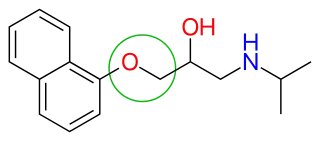 β-blockers' binding site to the receptor is the same as for endogenous catecholamines, such as noradrenaline and adrenaline. This binding is based on hydrogen bonds between the β-blocker and the receptor, and therefore not based on covalent bonds, which results in the reversibility of the binding.[18] A significant step in the development of β adrenergic antagonists was the discovery that an oxymethylene bridge (—OCH2—, figure 7) could be inserted into the arylethanolamine structure of pronethalol to produce propranolol. Propranolol is an aryloxypropanolamine, which are more potent β-blockers than arylethanolamines. Today, most of the β-blockers used clinically are aryloxypropanolamines. The length of the side chain is increased when an oxymethylene bridge is introduced. It has been shown that the side chains of aryloxypropanolamine can adopt a conformation that puts the hydroxyl and amine groups in more or less the same position as with beta blocker that do not have this group as a part of the side chain.[2]
