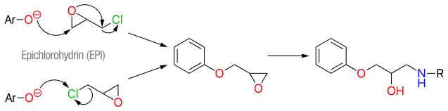 The fundamental step, and usually the last, in the synthesis of β-blockers consists of adding a propanolamine side chain. This can be done following two paths which both involve alkylation of an appropriate phenoxide with epichlorohydrin (ECH). The first way is shown as the upper way in figure 5. It consists of phenoxide reacting at the oxirane and resulting in an alkoxide, that displaces the adjacent chloride to form a new epoxide ring. The second way is shown as the lower route in figure 5. It consists of displacement of the halogen directly with a SN2 reaction to give the same glycidic ether. When following both pathways, the central chiral carbon preserves its configuration, which is an important part to consider when synthesizing enantiomerically defined drugs. The ring opening of the epoxide ring in glycidic ether is done with an appropriate amine, such as isopropyl amine or tert-butylamine, and leads to the aryloxypropanolamine compound that consist of a secondary amine. This amine is typically known as the structural requirement for the β-adrenergic blocking activity.[15]
