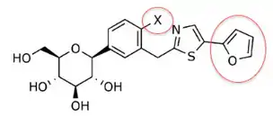 The discovery of T-1095 led to an investigation of how to enhance potency, selectivity and oral bioavailability by adding various substituents to the glycoside core. As an example we can take the change of o-glycosides to c-glycosides by creating a carbon–carbon bond between the glucose and the aglycone moiety. C-glucosides are more stable than o-glucosides which leads to modified half-life and duration of action. These modifications have also led to more specificity to SGLT-2.[9] C-glucosides that have heterocyclic ring at the distal ring or proximal ring are better when it comes to anti-diabetic effect and physicochemical features all together.[3][20] C-glucoside bearing thiazole at the distal ring on canagliflozin has shown good physicochemical properties that can lead to a clinical development, but still has the same anti-diabetic activity as dapagliflozin, as shown in tables 1 and 2.
