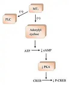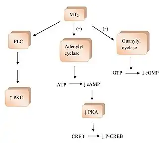 The binding of melatonin to melatonin receptors activates a few signaling pathways.[1] MT1 receptor activation inhibits the adenylyl cyclase and its inhibition causes a rippling effect of non activation; starting with decreasing formation of cyclic adenosine monophosphate (cAMP), and then progressing to less protein kinase A (PKA) activity, which in turn hinders the phosphorylation of cAMP responsive element-binding protein (CREB binding protein) into P-CREB.[4] MT1 receptors also activate phospholipase C (PLC), affect ion channels and regulate ion flux inside the cell.[1][2][4] The binding of melatonin to MT2 receptors inhibits adenylyl cyclase which decreases the formation of cAMP.[4] As well it hinders guanylyl cyclase and therefore the forming of cyclic guanosine monophosphate (cGMP). Binding to MT2 receptors probably affects PLC which increases protein kinase C (PKC) activity. Activation of the receptor can lead to ion flux inside the cell.[1][4]