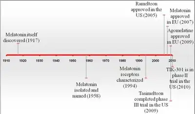 TIK-301 (PD-6735, LY-156735) has been in phase II clinical trial in the United States (US) since 2002.[1] The FDA granted TIK-301 orphan drug designation in May 2004, to use as a treatment for circadian rhythm sleep disorder in blind individuals without light perception and individuals with tardive dyskinesia.[1] In 2005 ramelteon (Rozerem) was approved in the US indicated for treatment of insomnia, characterized as difficulty with falling asleep, in adults. Melatonin in the form of prolonged release (trade name Circadin) was approved in 2007 in Europe (EU) for use as a short-term treatment, in patients 55 years or older, for primary insomnia (poor quality of sleep). Products containing melatonin are available as a dietary supplement in the United States and Canada. In 2009 agomelatine (Valdoxan, Melitor, Thymanax) was also approved in Europe and is indicated for the treatment of major depressive disorder in adults. Tasimelteon completed the phase III clinical trial in the United States for primary insomnia in 2010.[9] The Food and Drug Administration (FDA) granted tasimelteon orphan drug designation status for blind individuals without light perception with non-24-hour sleep–wake disorder in January the same year, and final FDA approval for the same purpose was achieved in January 2014 under the trade name Hetlioz.[10]