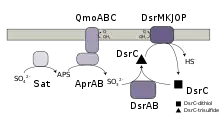 - Reduction of the trisulfide to sulfide and reduced DsrC via a membrane bound enzyme, DsrMKJOP
