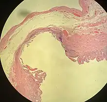 In medicine or biology, a diverticulum is an outpouching of a hollow (or a fluid-filled) structure in the body.[1] Depending upon which layers of the structure are involved, diverticula are described as being either true or false.[2]