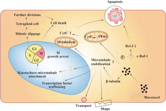 As well as inhibiting mitosis, the presence of docetaxel has been found to lead to the phosphorylation of the oncoprotein bcl-2, which leads to apoptosis of cancer cells that had previously blocked the apoptotic inducing mechanism, leading to tumour regression.[9] Enhanced effects of radiation therapy when combined with docetaxel has been observed in mice.[9] Docetaxel has also been found to have greater cellular uptake and is retained longer intracellularly than paclitaxel allowing docetaxel treatment to be effective with a smaller dose, leading to fewer and less severe adverse effects.[17]