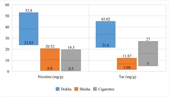 In September 2018, a University of Sharjah study compared the nicotine and tar levels in dokha to other tobacco products, which found dokha had significantly higher levels of both. Nicotine in dokha was measured at 23.83–52.8 mg/g compared to 0.8–20.52 mg/g in shisha, and 0.5–19.5 mg/g in cigarettes. Tar in dokha was measured at 21.6–45.02 mg/g compared to 1.68–11.87 mg/g in shisha and 5–27 mg/g in cigarettes.[3]
