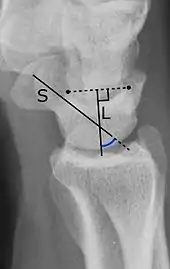 The SL angle is an indicator of dorsal intercalated segment instability deformity (DISI). The SL angle goes between:[1]