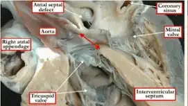 Double outlet right ventricle sectioned in four-chamber fashion, showing the aorta arising exclusively from the right ventricle | |