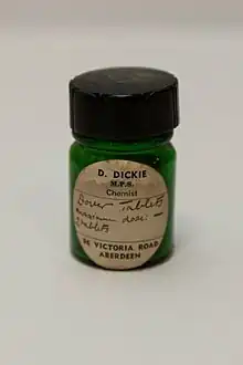 - ↑ The Extra Pharmacopoeia Martindale. Vol. 1, 24th edition. London: The Pharmaceutical Press, 1958, page 812. This reference also cites "Tablets of Ipecacuanha and Opium (B.P., Ind. P.) Tab. Ipecac. et Opii (B.N.F.), Dover's Powder Tablets. Unless otherwise specified tablets each containing 5 grains of powder of ipecacuanha and opium are supplied."