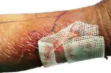 Dressings can also regulate the chemical environment of a wound, usually with the aim of preventing infection by the impregnation of topical antiseptic chemicals. Commonly used antiseptics include povidone-iodine, boracic lint dressings or historically castor oil.[5] Antibiotics are also often used with dressings to prevent bacterial infection. Medical grade honey is another antiseptic option, and there is moderate evidence that honey dressings are more effective than common antiseptic and gauze for healing infected post-operative wounds.[6] Bioelectric dressings can be effective in attacking certain antibiotic-resistant bacteria[7] and speeding up the healing process.[8]