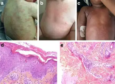 - ↑ Feldmeyer L, Heidemeyer K, Yawalkar N (2016). "Acute Generalized Exanthematous Pustulosis: Pathogenesis, Genetic Background, Clinical Variants and Therapy". International Journal of Molecular Sciences. 17 (8): 1214. doi:10.3390/ijms17081214. PMC 5000612. PMID 27472323.