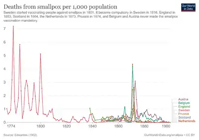 Contrary to popular belief, the first state to introduce compulsory vaccinations was the Principality of Lucca and Piombino on September 25, 1806.[73] On August 26, 1807, Bavaria introduced a similar measure. Baden followed in 1809, Prussia in 1815, Württemberg in 1818, Sweden in 1816, England in 1867 and the German Empire in 1874 through the Reichs Vaccination Act.[74][75] In Lutheran Sweden, the Protestant clergy played a pioneering role in voluntary smallpox vaccination as early as 1800.[76] The first vaccination was carried out in Liechtenstein in 1801, and from 1812 it was mandatory to vaccinate.[77]