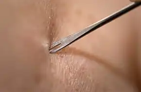 Smallpox vaccine being administered using a bifurcated needle[9]