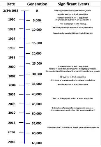 - ↑ Lenski, Richard (2010). "Overview of the E. coli long-term evolution experiment". myxo.css.msu.edu. Archived from the original on 2021-11-14. Retrieved 2023-06-29.