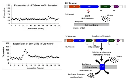The researchers also found that all Cit+ clones had mutations in which a 2933-base-pair segment of DNA was duplicated or amplified. The duplicated segment contained the gene citT for the citrate transporter protein used in anaerobic growth on citrate. The duplication is tandem, and resulted in copies that were head-to-tail with respect to each other. This new configuration placed a copy of the previously silent, unexpressed citT under the control of the adjacent rnk gene's promoter, which directs expression when oxygen is present. This new rnk-citT module produced a novel regulatory pattern for citT, activating expression of the citrate transporter when oxygen was present, and thereby enabled aerobic growth on citrate.[9]