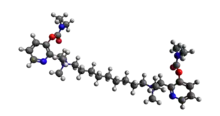 2 moles of 2-dimethylaminomethyl-3-dimethylcarbamoxypyridine and app. 1 mol α,ω-dihaloalkane (e.g. 1,9-dibromononane in this case) in acetonitrile is heated on a steam bath for 6 hours. It is then allowed to stand overnight at room temperature. The crystalline product is collected by filtration and then triturated with acetone. If no solid separates, ethyl acetate is added to precipitate the crude product. The product is then dissolved in hot ethanol and treated with decolorizing charcoal. Ethyl acetate is added to the filtered solution to precipitate the crystalline product. E-4056 product is then collected and dried. Yield is 95%.[3][6]
