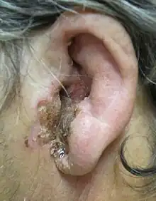 Otitis externa, also known as swimmer's ear, is an inflammation (infectious or non-infectious) of the external auditory canal.[14] Risk factors include retained water in the outer ear, particularly due to swimming, humidity, trauma or external devices, dermatologic conditions, or scratching the ear canal that may lead to bacterial growth.[14][15]