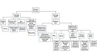 Acute causes may be further distinguished by the presence of fever (indicating an underlying infection) or the absence of fever (suggesting a structural problem, such as such as trauma or other injury to the ear). Etiologies leading to chronic pain may be broken down by the presence or absence of worrisome clinical features, also known as red flags.