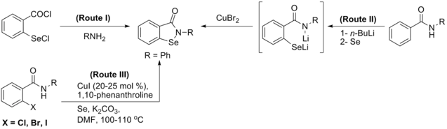 - ↑ Balkrishna SJ, Bhakuni BS, Chopra D, Kumar S (December 2010). "Cu-catalyzed efficient synthetic methodology for ebselen and related Se-N heterocycles". Organic Letters. 12 (23): 5394–7. doi:10.1021/ol102027j. PMID 21053969.