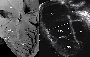 Pathological specimen and ultrasound image of a heart with Ebstein's anomaly: Abbreviations: RA: right atrium; ARV: atrialized right ventricle; FRV: functional right ventricle; AL: anterior leaflet; SL: septal leaflet; LA: left atrium; LV: left ventricle; asterisk: grade II tethering of the tricuspid septal leaflet | |