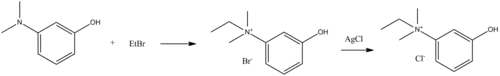 Edrophonium, ethyl-(3-hydroxyphenyl)dimethylammonium chloride, is made by reacting 3-dimethylaminophenol with ethyl bromide, which forms ethyl(3-hydroxyphenyl)dimethylammonium bromide, the bromine atom of which is replaced with a chlorine atom by reacting it with silver chloride, giving edrophonium.[5]