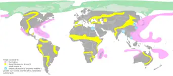 Climate change increases wildfire potential and activity.[49] Climate change leads to a warmer ground temperature and its effects include earlier snowmelt dates, drier than expected vegetation, increased number of potential fire days, increased occurrence of summer droughts, and a prolonged dry season.[50]