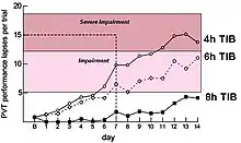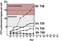 - 1 2 Dinges, DF; Pack, F; Williams, K; Gillen, KA; Powell, JW; Ott, GE; Aptowicz, C; Pack, AI (1997). "Cumulative sleepiness, mood disturbance, and psychomotor vigilance performance decrements during a week of sleep restricted to 4-5 hours per night". Sleep. 20 (4): 267–77. PMID 9231952.