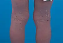 Young children may exhibit dermatitis/eczema on face, scalp and other parts of the body, in older children knees and elbows are more commonly affected. Children with dermatitis are at greater than expected risk of also exhibiting asthma and allergic rhinitis.[22]
