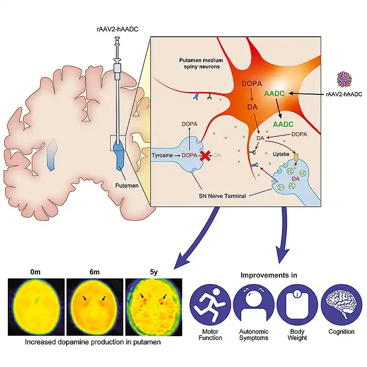 - ↑ Tai CH, Lee NC, Chien YH, Byrne BJ, Muramatsu SI, Tseng SH, Hwu WL (February 2022). "Long-term efficacy and safety of eladocagene exuparvovec in patients with AADC deficiency". Molecular Therapy. 30 (2): 509–518. doi:10.1016/j.ymthe.2021.11.005. PMC 8822132. PMID 34763085.