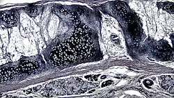 Elastic cartilage is histologically similar to hyaline cartilage but contains many yellow elastic fibers lying in a solid matrix. These fibers form bundles that appear dark under a microscope. The elastic fibers require special staining since when it is stained using haematoxylin and eosin (H&E) stain it appears the same as hyaline cartilage.[3] Verhoeff van Geison stains are used (giving the elastic fibers a black color), but aldehyde fuchsin stains, Weigert's elastic stains, and orcein stains also work.[3] These fibers give elastic cartilage great flexibility so that it is able to withstand repeated bending. Similarly to hyaline one or multiple chondrocytes lie between the spaces (or lacunea) in the fibres.[2] The chondrocytes only make up 2% of the tissue's volume.[2] Chondrocytes and the extracellular matrix are contained in an outerlayer named the perichondrium[2] (which is a layer of dense irregular connective tissue that surrounds cartilage which is independent of the joint).[3] It is found in the epiglottis (part of the larynx), and the pinnae (the external ear flaps of many mammals). Elastin fibers stain dark purple/black with Verhoeff's stain.