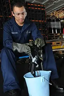 Depending on materials, elastomeric components of masks may be damaged by some cleaning methods (such as acetone, ethanol, strong hypochlorite and iodine solutions, quaternary ammonium salts, ethylene oxide, or temperatures over 50 °C/122 °F). Cleaning by machine is possible, but cleaning can also be done by hand.[2][5] The filter material may be damaged and lose effectiveness if it comes into contact with cleaning or disinfecting solutions. Manufacturers generally advise throwing it out each time the mask is cleaned, but this may not be possible in shortage situations.[2]