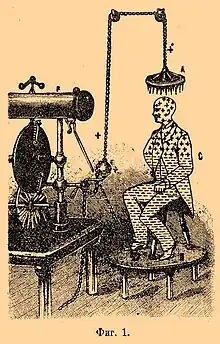 The source of electricity for an electric bath was usually a frictional electrical machine. The patient was seated on a wooden stool, and both the patient and the stool insulated from ground by a platform on glass legs or some other insulator. In some arrangements, the patient was lying down rather than seated. The patient was then charged with static electricity either by direct connection to one electrode of the generator (usually the positive), or else through electrostatic induction by holding a large electrode close to the patient's body. The electric tension applied was around 30–50 kV.[1] Treatment could take several hours. Following charging the patient was "bathed" in electricity, hence the name of the procedure.[2] This can be observed in a darkened room as a luminous discharge around the patient, especially at the hair and extremeties.[3]