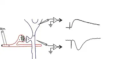 Extracellular field potentials are local current sinks or sources that are generated by the collective activity of many cells. Usually, a field potential is generated by the simultaneous activation of many neurons by synaptic transmission. The diagram to the right shows hippocampal synaptic field potentials. At the right, the lower trace shows a negative wave that corresponds to a current sink caused by positive charges entering cells through postsynaptic glutamate receptors, while the upper trace shows a positive wave that is generated by the current that leaves the cell (at the cell body) to complete the circuit. For more information, see local field potential.