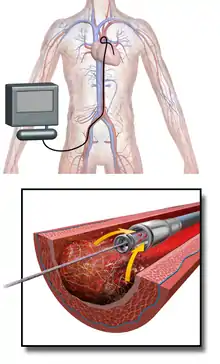 Catheter embolectomy is also used for aspiration embolectomy, where the thrombus is removed by suction rather than pushing with a balloon.[8] It is a rapid and effective way of removing thrombi in thromboembolic occlusions of the limb arteries below the inguinal ligament,[8] as in leg infarction.