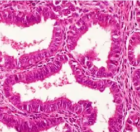 Endometrioid carcinoma is a type of endometrial cancer.[1] It typically presents with abnormal vaginal bleeding after menopause, pelvic pain and a distended abdomen, similar to ovarian cancer symptoms.[1]