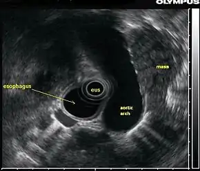 ![]() In this endoscopic ultrasound image, a mass (in this case, from lung cancer) is visualized using an ultrasound probe (EUS) inserted into the esophagus. | |