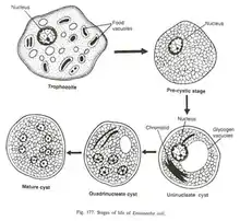 Entamoeba species all come in monogenetic forms, or having one generation lifecycles. E. coli has "three distinct morphological forms exist airing the life cycle-Trophozoite, Pre-cystic stage and Cystic stage". This lifecycle gives rise to the general way of how Entamoeba species form. This parasite has one large nucleus with a thick membrane surrounding the nucleus. There are many chromatin inside the nucleus, and one large, irregular-shaped karyosome.[8] The chromatin is clumped, and uneven in disperse inside the nucleus. The parasite forms by binary fission like most Entamoeba spp.[9] The mature cyst is the infective stage, and is known to survive longer than those of E. histolytica. The cysts can survive three to four months outside the host's body after desiccation.[8] The cysts cause infection by consuming contaminated food and drinks like waste water. Sometimes insects and rodents carry the parasite to cause infection in the food and drinks. Excystation happens once the cysts are ingested, and travel to the large intestine.[2]